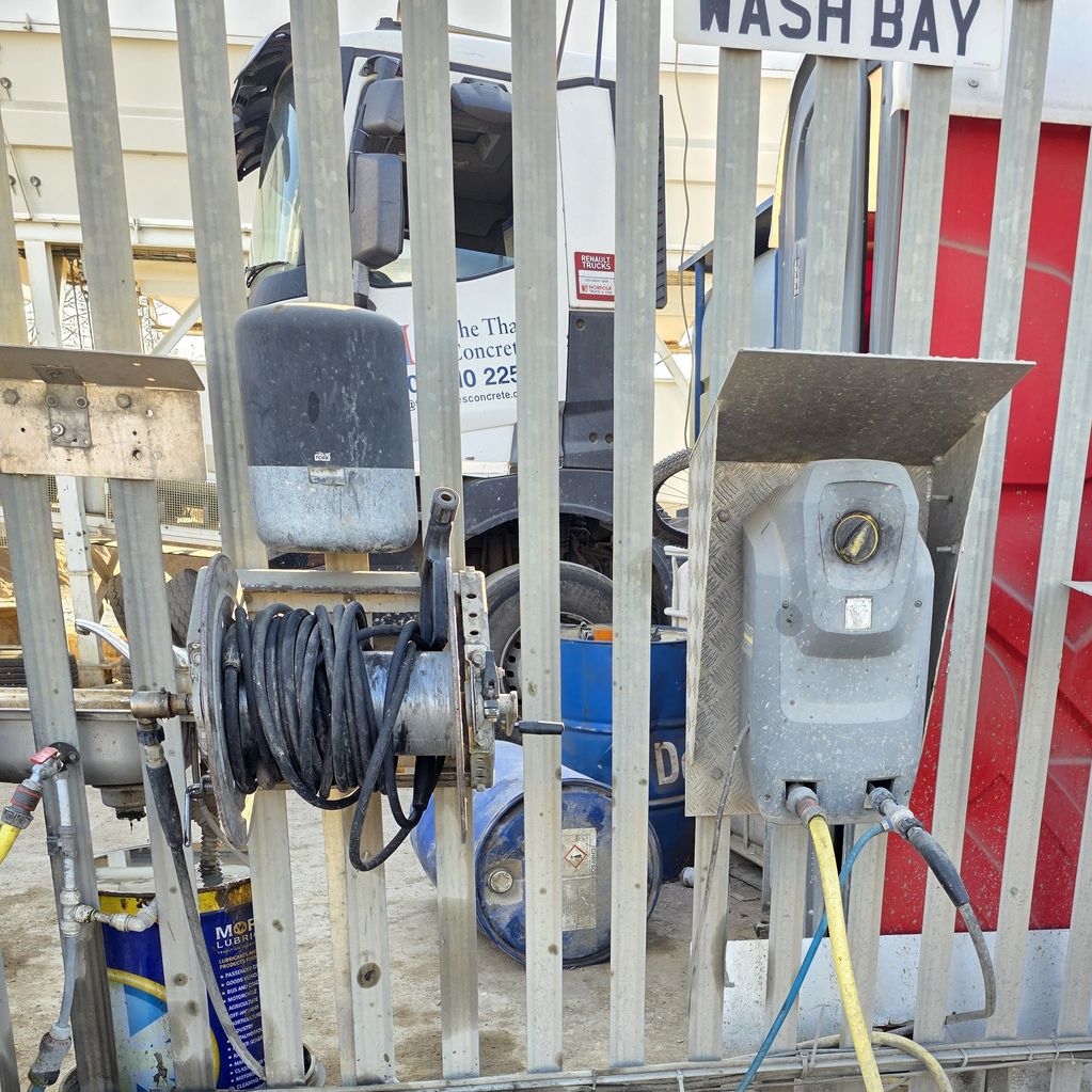 A setup upgraded by Jet Tech Solutions at a customer's site. This machine is mounted to the fence and connected to a hose reel. The setup includes interchangeable lances, allowing the customer to use high pressure as well as snow foam to wash vehicles.